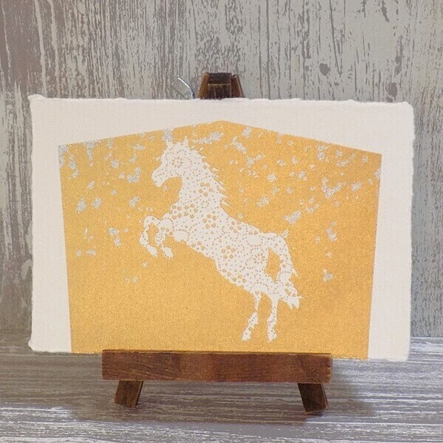 ※複数枚ご要望の場合はご入金される前に必ずコンタクト(お問い合わせ)から、ご要望枚数をお知らせください。お客様専用のカートを用意させていただきます。 ※⚠10枚以上のご購入の場合、送料はクリックポスト(¥185)を指定してください!! 金彩工芸は桃山・江戸時代に確立された帯や着物等布に金箔を施す技術です。 その技術を生かして制作しました来年の干支である「午」の金泥加工の和紙製のポストカードです。 金泥 箔を接着させる糊(樹脂)に金箔紛を混ぜたもの。 箔を直接貼ったものよりもマット(艶消し)な仕上がりになります。 ★金箔紛は純金箔ではなく銀箔を着色した着色金箔を使用しており、経年で変色する可能性があります。 サイズは約14.8cm×10cm (ハガキサイズです) ※カードを立てる立ては付属しません。 ※ご覧になる環境により、実際の商品と 色味具合が異なって見える場合があります。