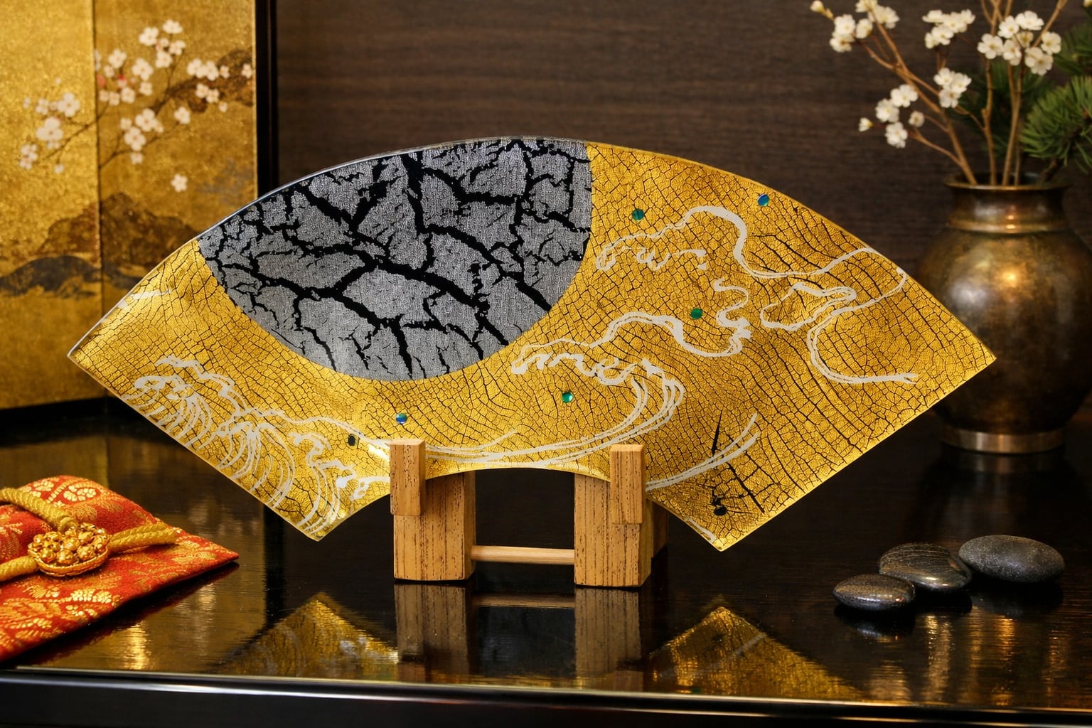 オーダー 京都 ガラス製飾り皿 金彩ガラス皿 「月に波」 扇形