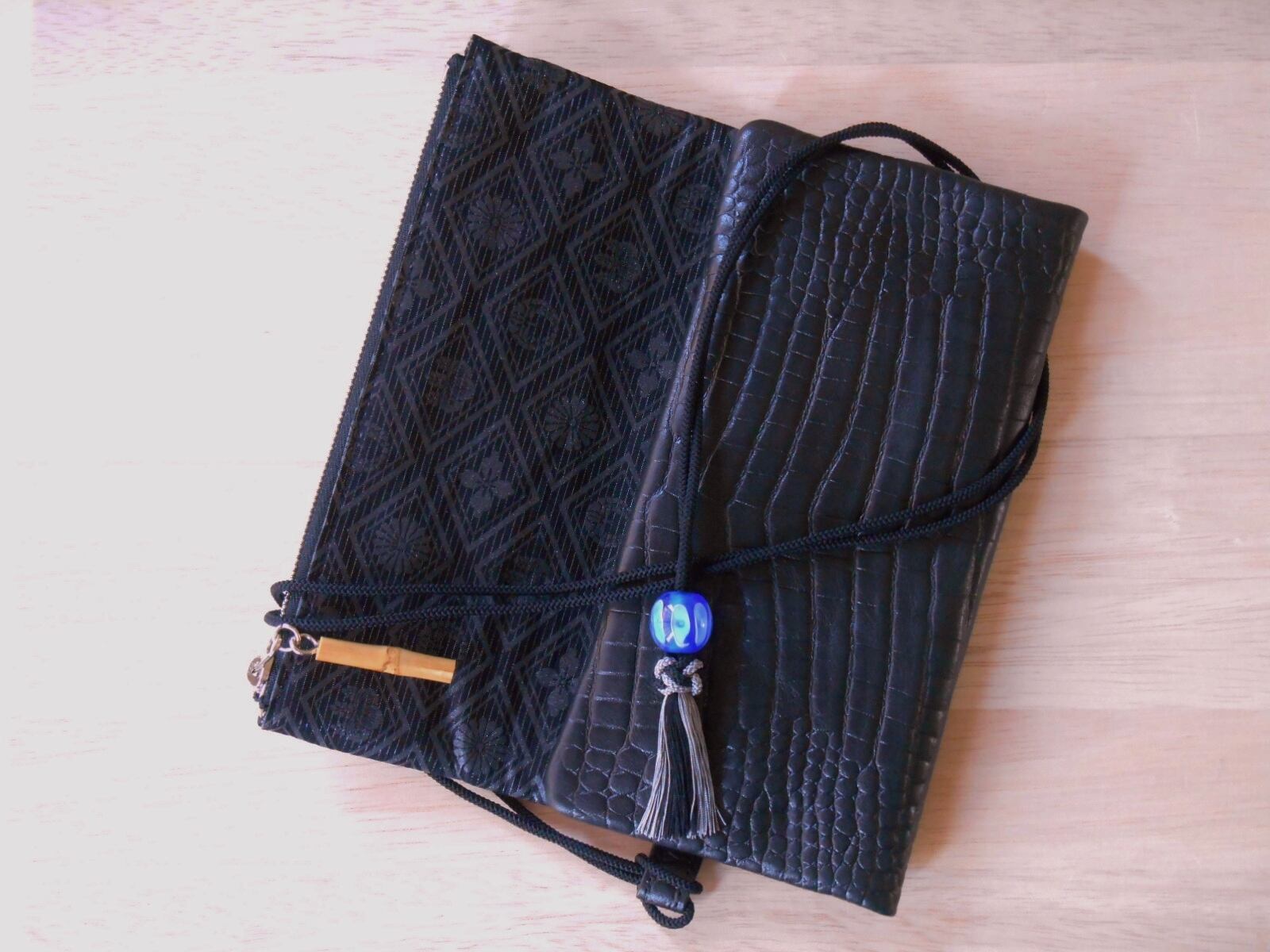 クロコ型押し本牛革黒色に正絹帯黒地(銀糸入り)に家紋菱柄をオリジナルの墨銀泥で摺り箔加工。