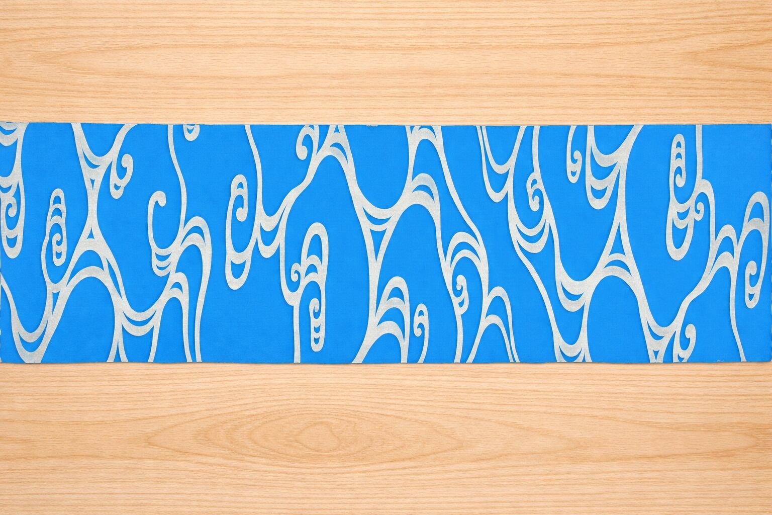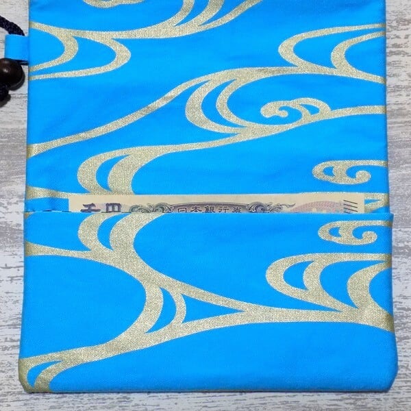 その技術を生かし、現代の日常で長く使っていただけるように素材はオックス水色を選び、流水文様を中色泥(金と銀の間の色目)で金彩加工しました道中財布です。