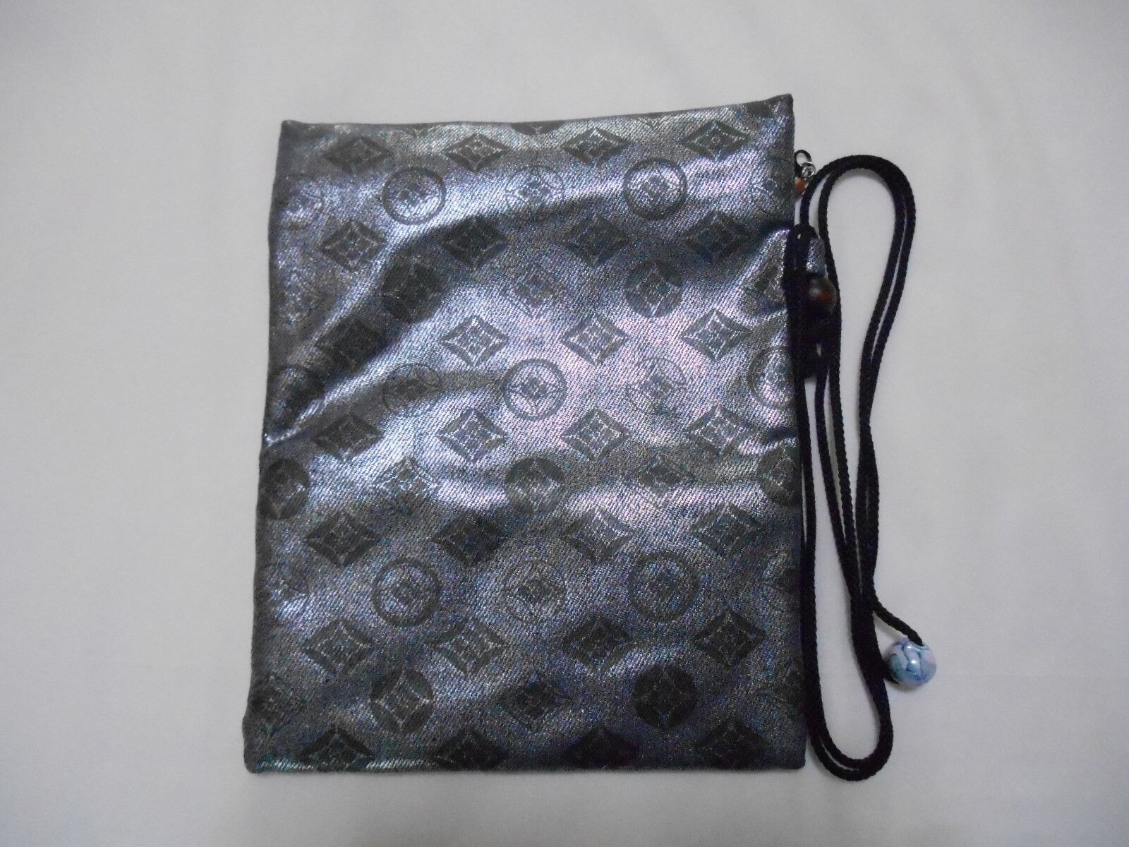 銀貼りデニム生地に墨銀で七宝柄を金彩加工しました道中財布です。