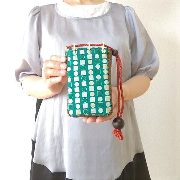 その技術を生かし、現在の日常で長く使っていただけるように素材は帆布グリーンを選び、四角丸紋様を金・銀泥で金彩加工しましたスマホケース&小物入れです。