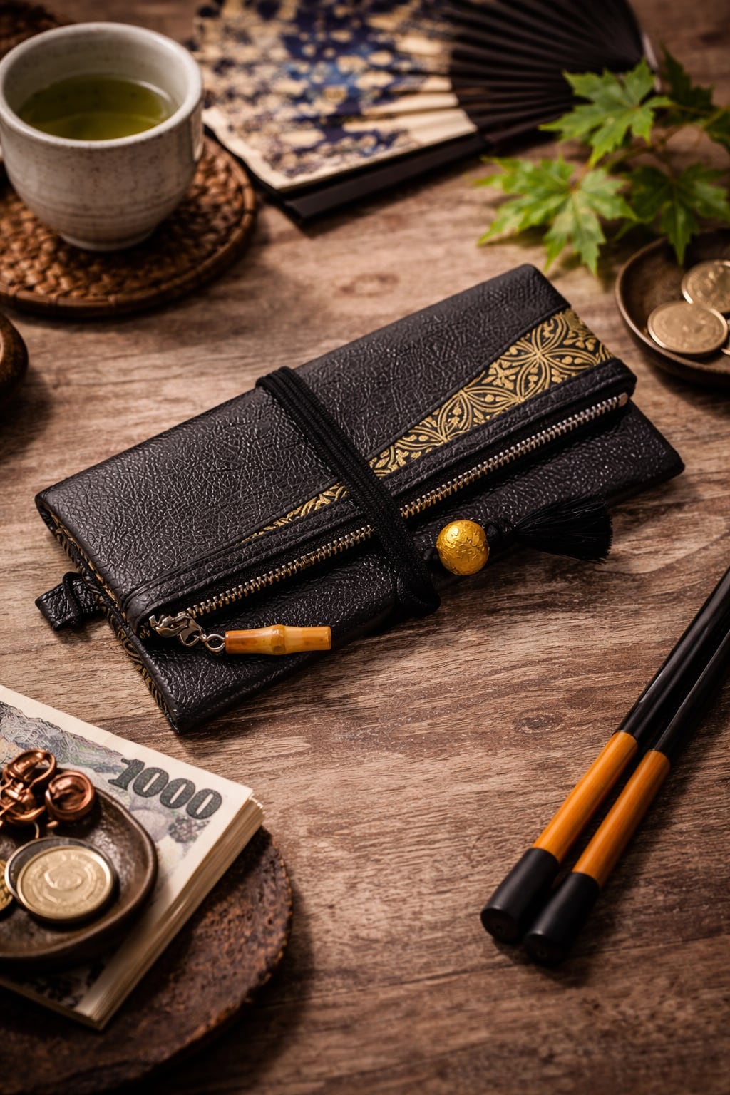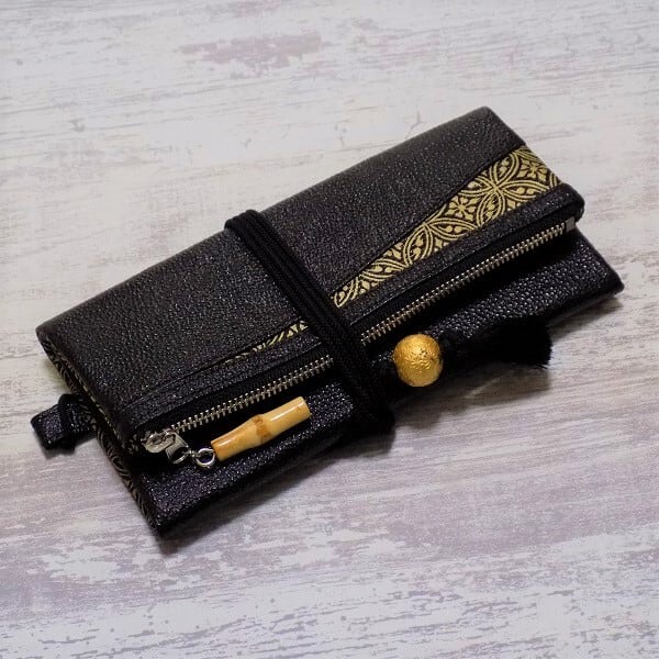 オーダー 京都 本革製道中財布 姫路黒桟革×金糸織帯地黒色製 「七宝 金」