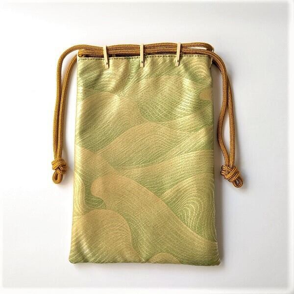 京都 正絹グリーン地 波 金泥ぼかし 信玄袋 合切袋 金 鯉