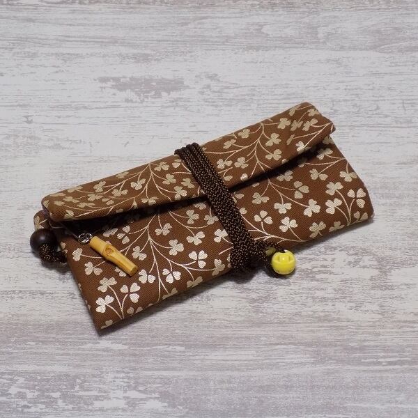 その技術を生かし、現代の日常で長く使っていただけるように素材はコットンツイルを選び、中色泥(金と銀の間の色目)でクローバー紋様を金彩加工しました道中財布です。