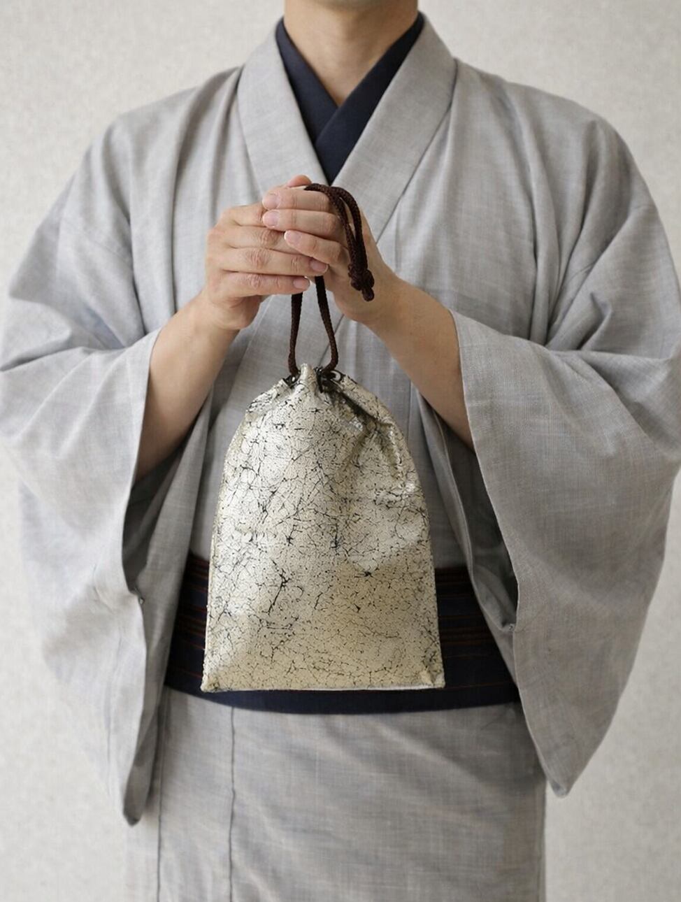 その技術を生かし、現代の日常で長く使っていただけるように素材はコットン紬風グリーン色地を選び、錫箔で真綿箔加工した合切袋(マチ無し信玄袋)です。