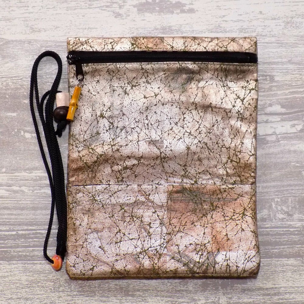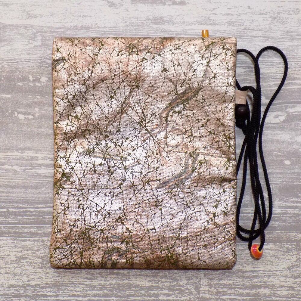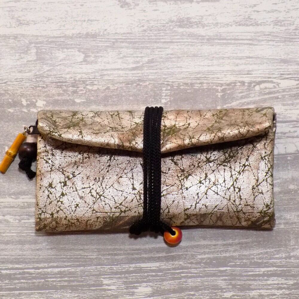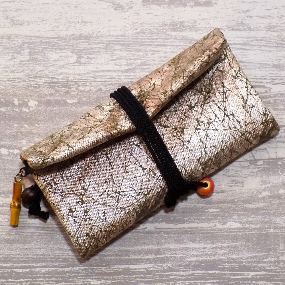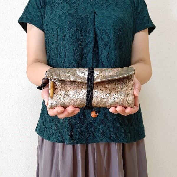 その技術を生かし、現代の日常で長く使っていただけるように素材はコットン紬風グリーン色地を選び、虹彩箔を使い真綿箔加工しました道中財布です。