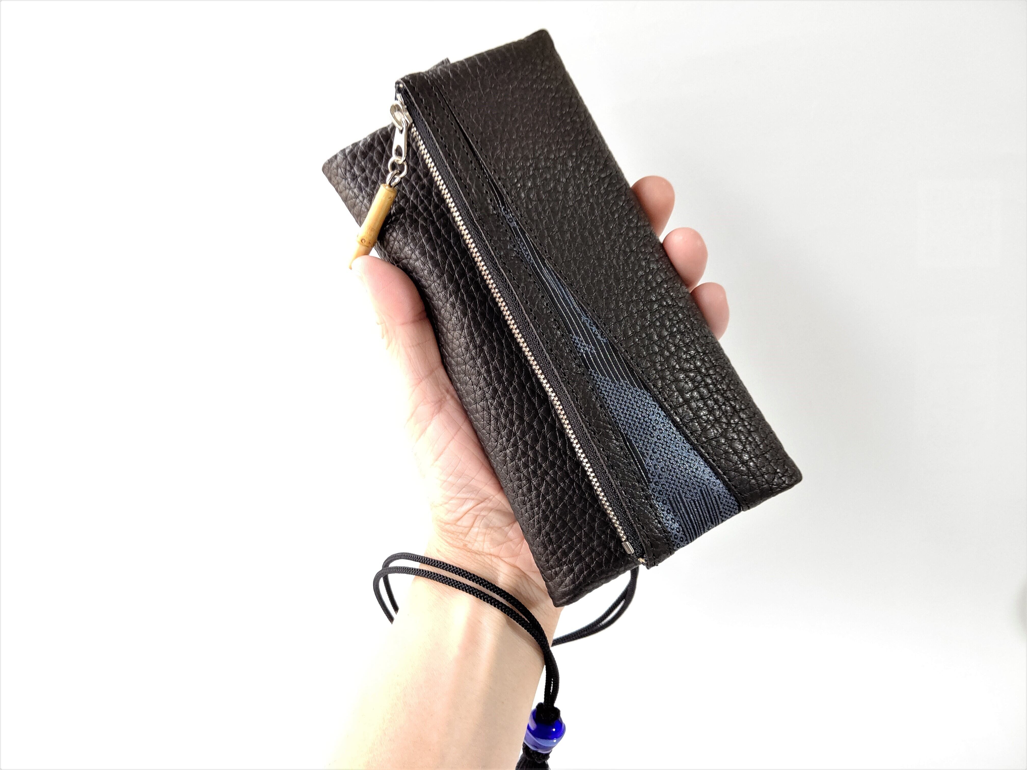 本牛革黒色(シュリンク加工)に銀糸入り西陣織帯地にオリジナルのカモフラ(迷彩)紋様を独自に調合した暗紺錆銀泥で摺箔加工。