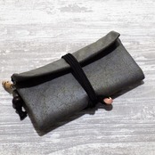 その技術を生かし、現代の日常で長く使っていただけるように素材はコットン紬風グリーン色地を選び、焼箔の黒箔を使い真綿箔加工しました道中財布です。