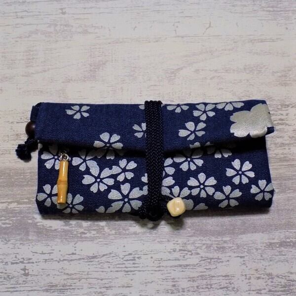 その技術を生かし、現代の日常で長く使っていただけるように素材はデニム紺色を選び、桜紋様を銀泥で金彩加工しました道中財布です。