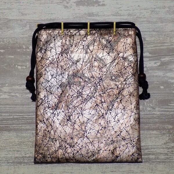 その技術を生かし、現代の日常で長く使っていただけるように素材はコットンオックス紺地を選び、虹彩箔淡色で真綿箔加工した合切袋(マチ無し信玄袋)です。