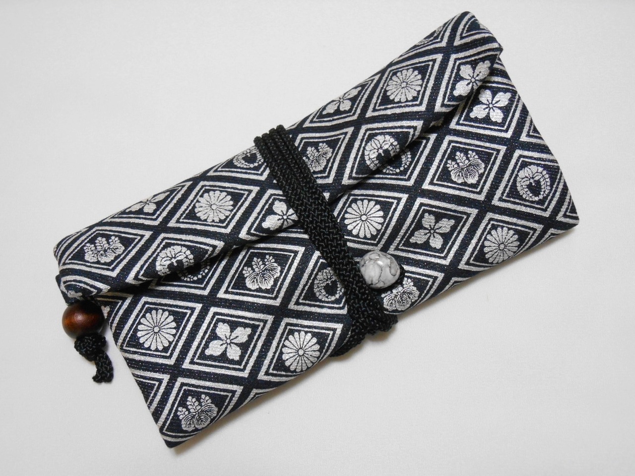 特選 道中財布 濃紺銀ラメデニム製 家紋菱 銀