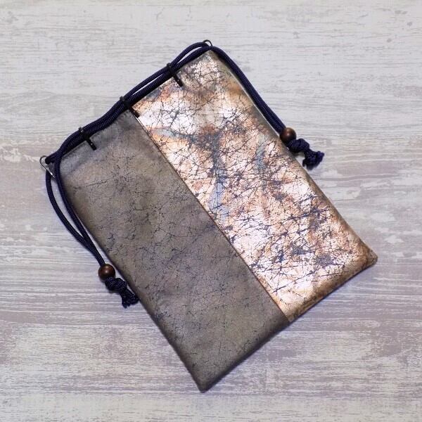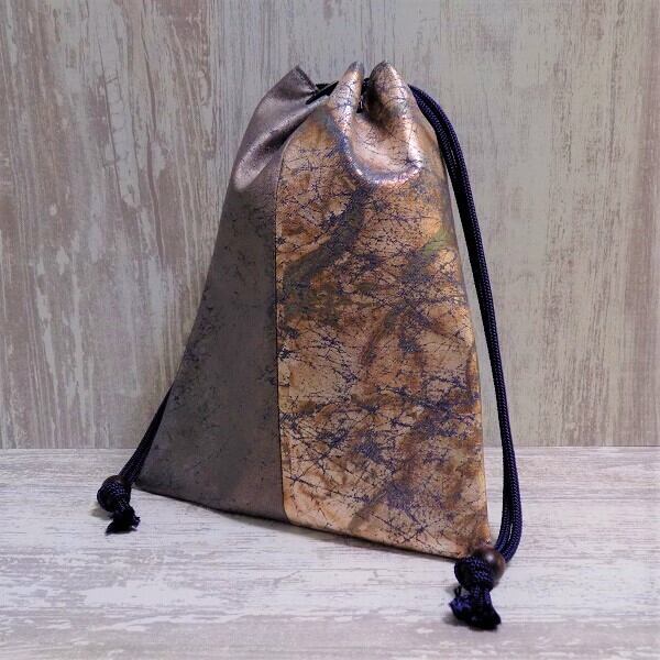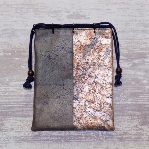 その技術を生かし、現代の日常で長く使っていただけるように素材はコットンオックス紺色地を選び、焼箔の黒箔と虹彩箔淡色を使い真綿箔加工した生地を組み合わせた合切袋(マチ無し信玄袋)です。