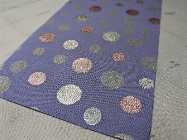 コットンスモーキーラベンダー色生地に水玉文様を銀箔濃淡+ピンク色箔で摺箔加工。