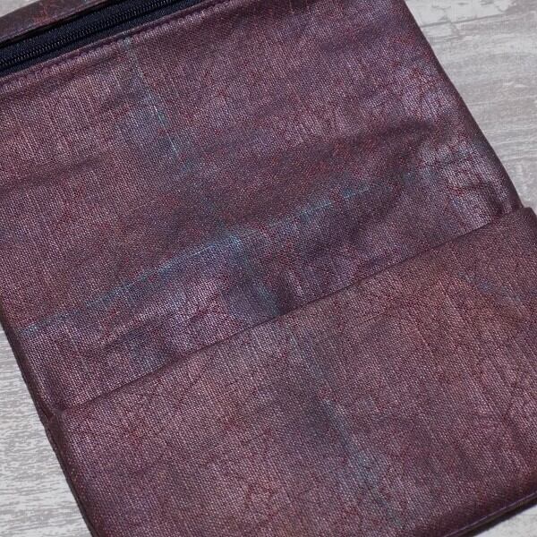 その技術を生かし、現代の日常で長く使っていただけるように素材はコットン紬風エンジ色地を選び、焼箔の青貝箔を使い真綿箔加工しました道中財布です。