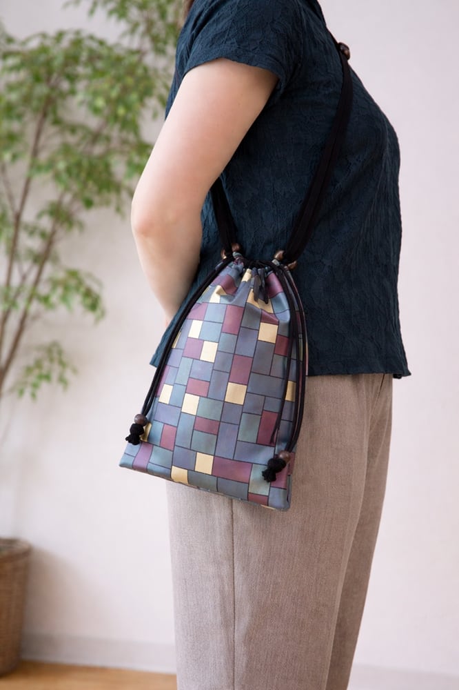 その技術を生かし、現代の日常で長く使っていただけるように素材はコットンオックス紺色地を選び、焼箔の青貝箔・赤貝箔・中金箔を使い、オリジナルのブロック文様を摺箔加工したショルダーストラップ付合切袋です。
