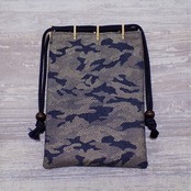 その技術を生かし、現代の日常で長く使っていただけるように素材はデニム紺色地を選び、カモフラ(迷彩柄)を銀泥で摺箔加工したマチ無し信玄袋です。