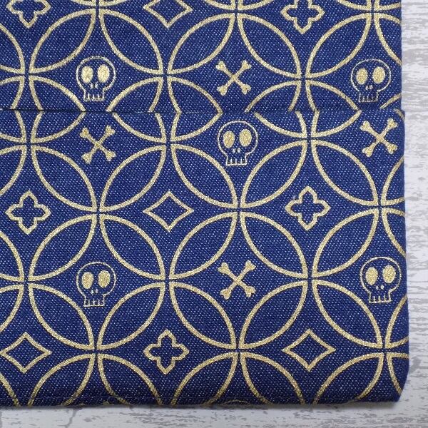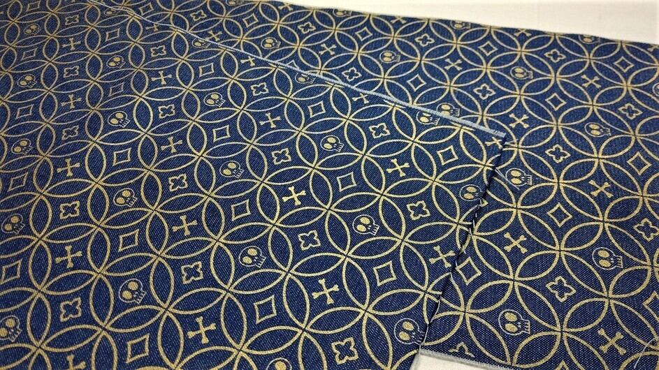 その技術を生かし、現在の日常で長く使っていただけるように素材はデニムを選び、金泥でオリジナルの髑髏(ドクロ)七宝紋様を金彩加工しました道中財布です。