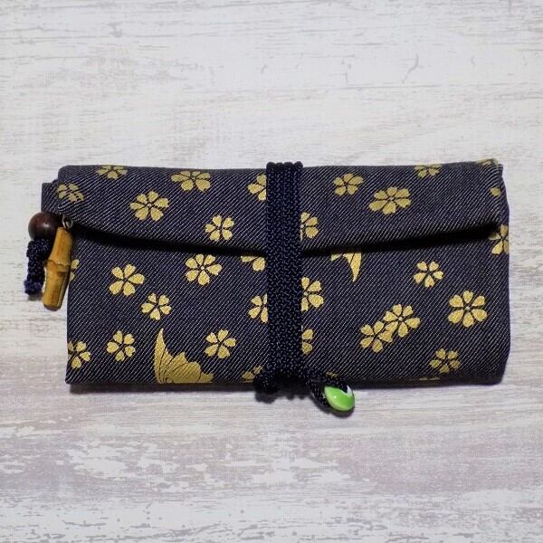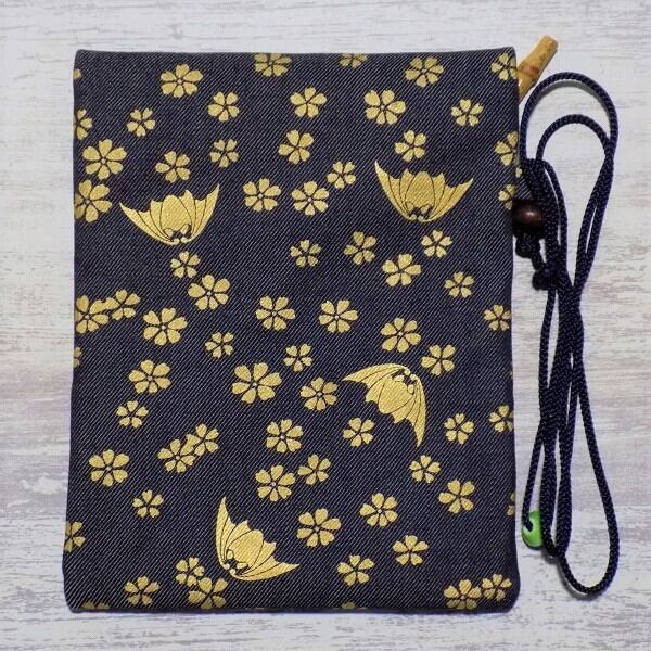 その技術を生かし、現代の日常で長く使っていただけるように素材は濃紺デニムを選び、金泥で蝙蝠に桜文様を金彩加工しました道中財布です。