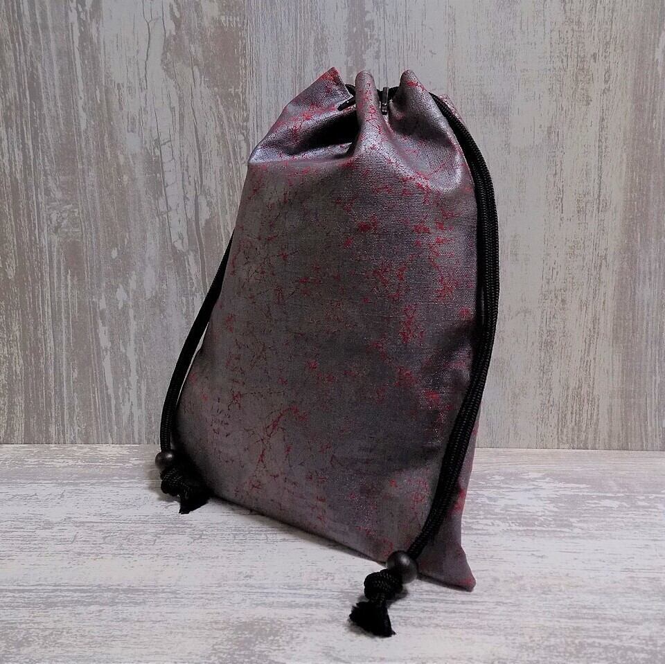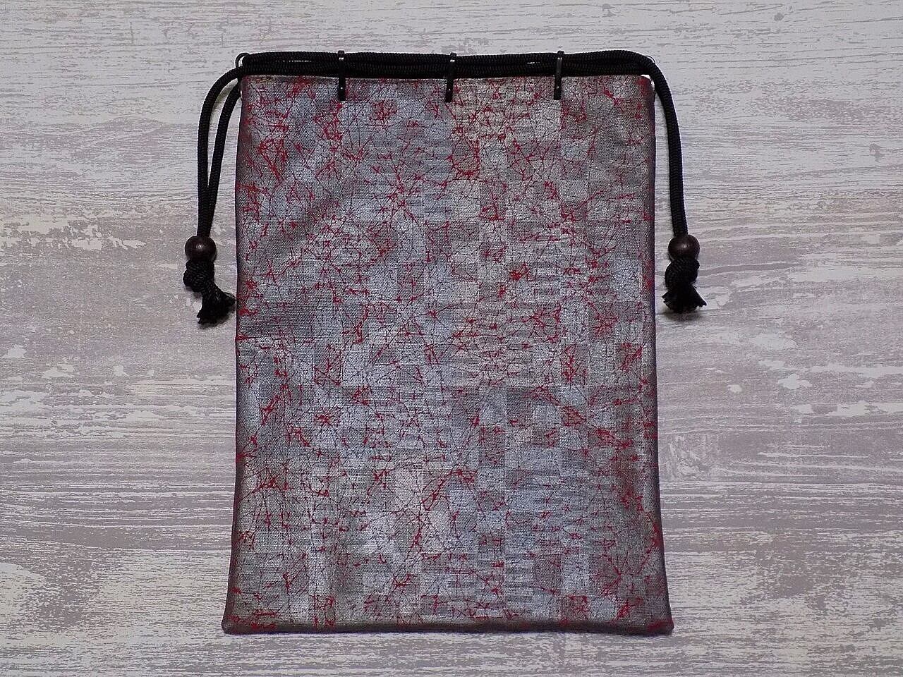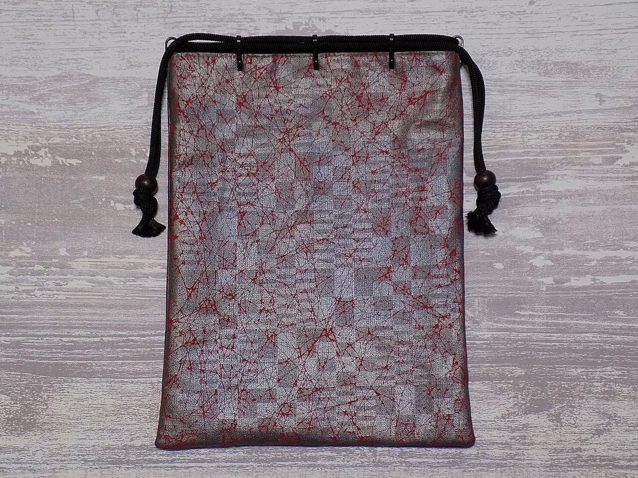 その技術を生かし、現代の日常で長く使っていただけるように素材はコットン紬風紅色地を選び、焼箔の黒箔を使い、エンボス加工のように薄っすらと映る市松文様の摺箔と紅色の地色が隙間から見える真綿箔との併用で金彩加工したショルダーストラップ付合切袋です。