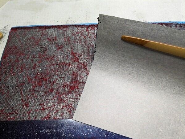 焼箔とは銀が硫化して変色する性質を利用したもので、硫黄分を含んだ紙や布をあてアイロンで熱を加えて変色させた箔になります。