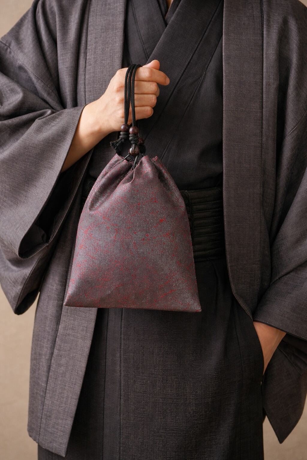オーダー 京都 コットン紬風紅色地製 「市松黒箔」 ショルダーストラップ付合切袋